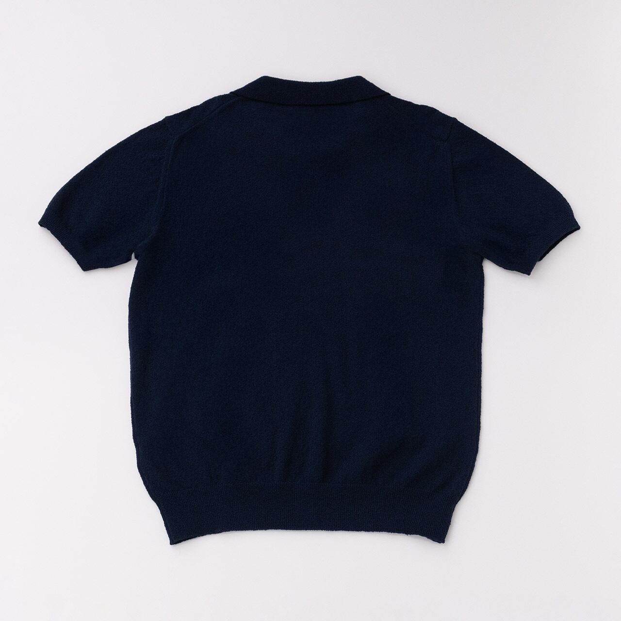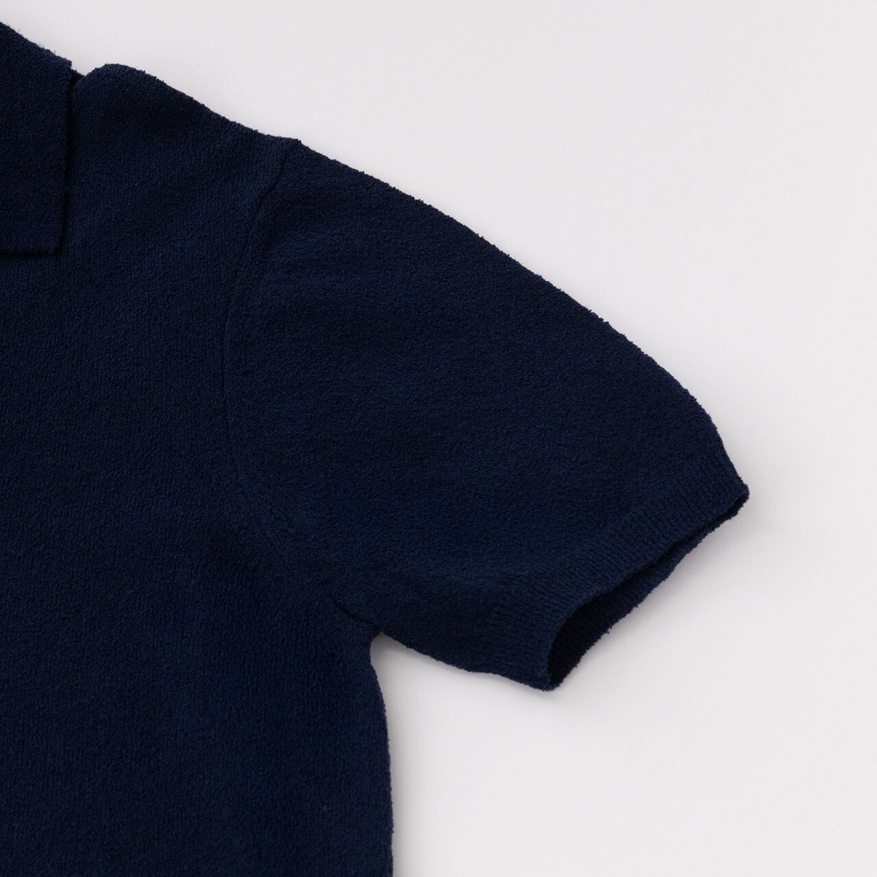 綿70%、ナイロン30%のパイル地半袖スキッパーポロニット。